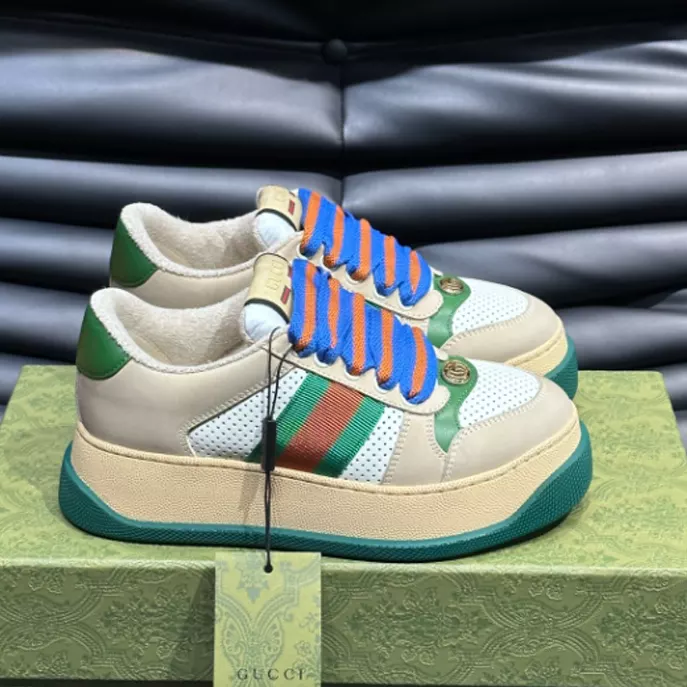 Accented by Gucci’s signature green and orange web stripes along the sides, it adds a bold pop of color that pays homage to classic ’70s sportswear. The chunky sole and soft, premium materials ensure comfort and durability, making it both stylish and practical. Perfect for those who appreciate vintage flair with high-end appeal, the Gucci Screener Trainer in Beige and Green adds a unique, heritage-inspired touch to any casual outfit.